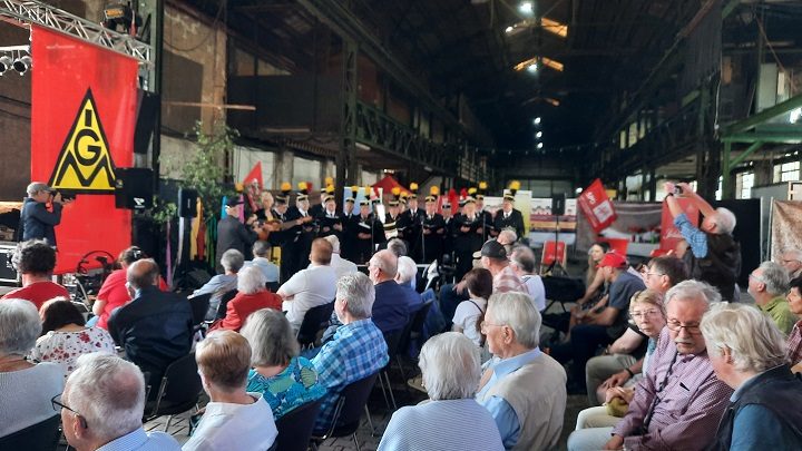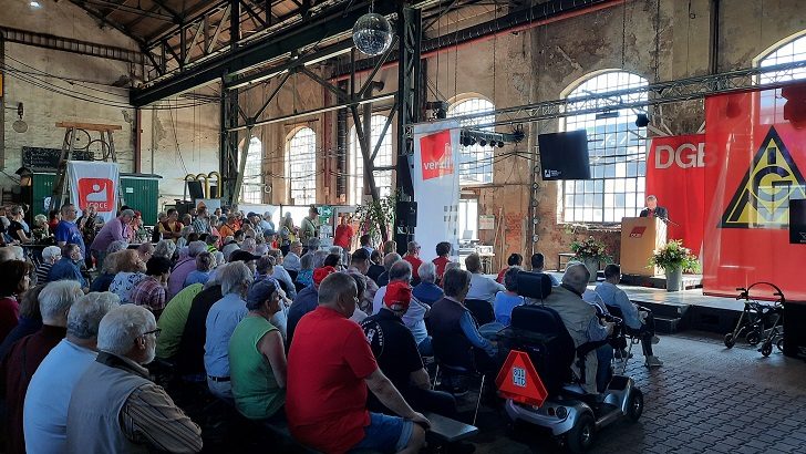 In der Zechenwerkstatt in Dinslaken-Lohberg versammelten sich ebenfalls zahlreiche Teilnehmerinnen und Teilnehmer. Dort sprachen Alexander Lazarevic vom DGB Dinslaken und Michaela Eislöffel, Bürgermeisterin von Dinslaken. Die Mai-Rede hielt Frederick Cordes, Generalsekretär der SPD NRW.